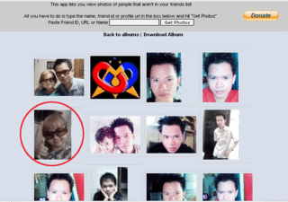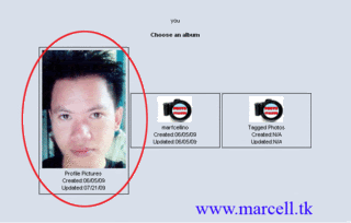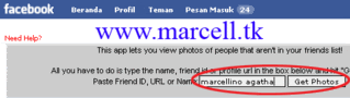 6. Masukkan alamat facebook atau ID orang yang ingin anda lihat Foto nya. Sebagai contoh ini M.A menggunakan ID milik pribadi "marcellino agatha", karena bila menggunakan ID orang lain sebagai contoh artikel ini dikwatirkan yang bersangkutan tidak berkenan karena bersifat privasi. Lihat gambar yang diberi lingkaran merah diatas dan klik Get Photos.